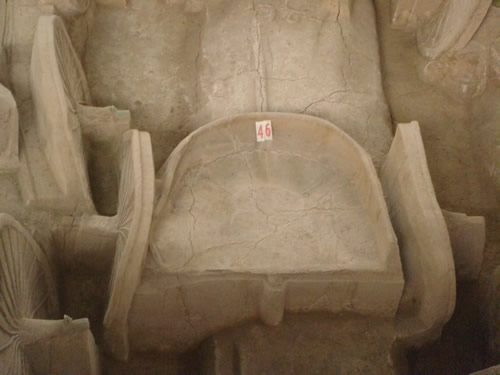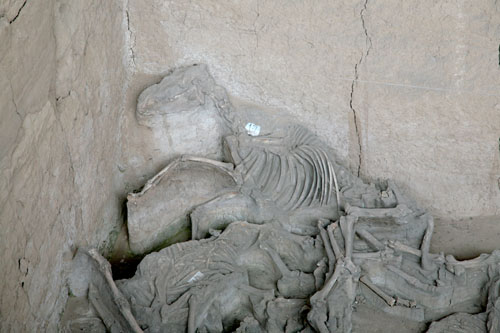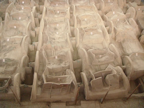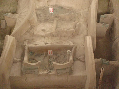已被泥土和岁月侵蚀的车铃依稀还在,车轴上雕刻精细的青铜轴盖上饕餮兽面纹仍大张着嘴巴,马鞭静静躺在角落里,车辕上连接战马的皮制缰绳也无声诉说当年情景,一墙之隔的战马似乎还在等待谁给它套上缰绳……