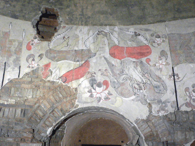 考古队员继续从墓道底部发掘,清理掉甬道里的填土和淤土,抬头一望,但见甬道口正上方绘着两只凌空而下的神兽,周围布满了云气、莲花等图案。而在甬道口东西两侧,各绘有一个身着艳服、手执短鞭、神情肃穆的门吏。