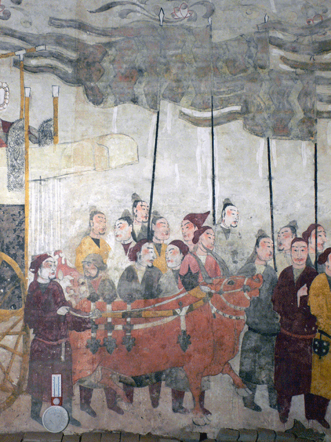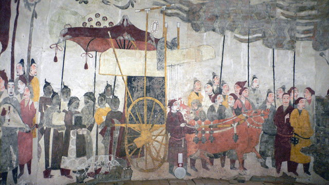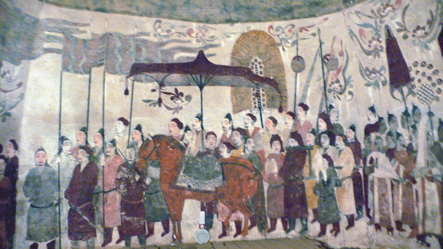 墓室内壁画到底有多奇特呢?环顾四周,你就会发现,从墓室、甬道、天井、过洞一直到墓道,每组画面都与另一组画面有自然过渡和衔接,且不受空间限制,可谓一气呵成,构成了一幅完整的家居图和出行仪仗图。画家竟将整座墓葬视为一块画布,组成一幅总长250米的大型画卷,再现了墓主生前的豪华与排场。真是匠心独具啊!