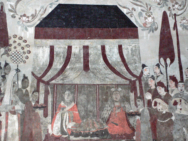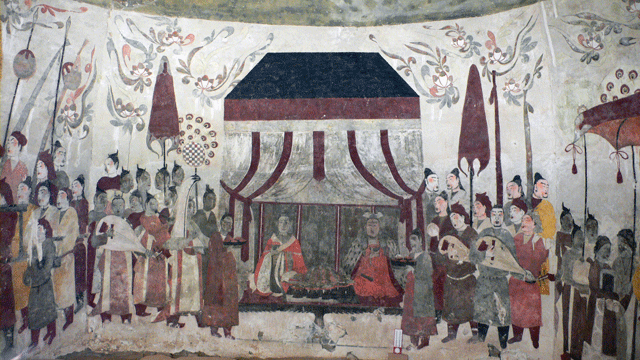 墓室壁画分为上下两层,穹顶上是天象图,宛如繁星点点,朵朵天莲花点缀其间,飘逸灵动。下层壁画绘着墓主人生前的生活图景。正对墓门的墓室北壁是一幅“坐帐宴饮图”,仆役侍从、乐舞百戏将雍容华贵的墓主夫妇拥坐于帐中榻上,二人面前摆满了五谷杂粮、美味佳肴,似乎要将世间美食极尽所能带到地府享用。