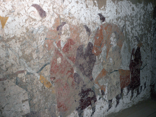 就这样,脆弱的墓道壁画近乎完整地被保存了下来。在长约22米、宽约3米的斜坡式墓道里,描绘着一支雄伟壮观的仪仗队,96个青壮年士兵神态各异,服装样式统一,而色彩不同,或执三旒旗,或吹长号,或佩剑带弓,或执缰牵马,展示了官宦人家出行时的生动景象。“在这样粗糙的墙面上,画家竟然用笔如行云流水,不起稿便一笔而就,几乎不见修改痕迹,功力非凡啊!墓道已是如此精彩,那墓室内还会有多少惊喜在等着我们呢?”大家都激动难耐,充满了期待。