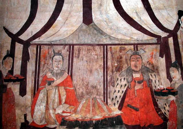 李非:是的,解不开的谜还很多,因为它是写实性的壁画,信息量很大,可谓当时生活的真实写照。比如,墓室北壁“坐帐宴饮图”中央有13个高足托盘盛放着各式菜肴,现在还说不清具体是什么菜名,这就需要搞烹饪技术的人去研究了。