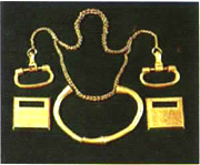 装有金器的木匣长40厘米、宽25厘米、高30厘米,多年的风化,木匣已腐蚀成了纤维状。西端放着扁圆形金片和金铤,金铤交替四层叠压在一起;东端放金箔三捆;在金铤、金箔之间放着金饰、金链和官服腰带上的金銙等,全部共有193件,合计总重为34810克,折合成纯金重量为33025.64克,且含金量竟在95%以上。