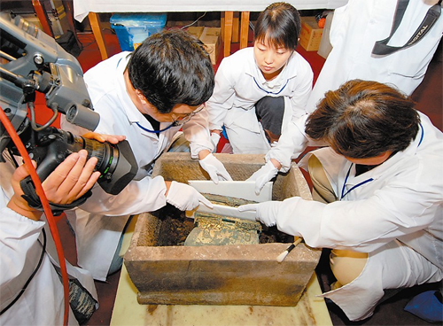 (711)的石碑,碑体厚重古朴,气韵不凡,碑首众龙盘曲弯转,碑面字体剥蚀漫漶,只有少数文字可以辨认。古槐和古碑算是寺院内所能直观的最古老的遗迹遗物了。据明嘉靖《太原县志》记载:“太山寺在县西十里风谷山之半,唐景云元年建。明洪武二十四年(1392)并观音童子五寺入焉。”可见这段文献是真实可信的。在古树下稍适休息后,再走一段山路来到位于三大士殿东面十数米的山坡台地处,便是唐代塔基和宝函地宫所在了。2008年5月8日,太山文物管理所在此处修建消防蓄水池时发现石门和石条,随即报请山西省文物局、国家文物局批准后,由太原市文物考古研究所和太山文物管理所组成联合考古队进行抢救性考古发掘。
