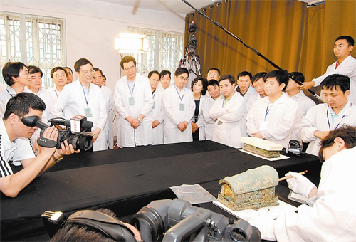 石函内盛装的金棺和银、铜、木椁制作精良,葬具套合规整、选料考究、装饰华贵,采用浮雕、镂雕、錾刻、鎏金等工艺,同时大量地使用绿松石、石英石作点缀。在雕凿方面,创作者为避免乏味的艺术流程,所刻画的四神、人物形象富有变化,栩栩如生,从而使谨严的宗教规制和高超的制作工艺和谐统一、有机结合。石函长57.5厘米、高31.2厘米,由函盖、函身扣合而成,外表刻文大都为供养人的姓名;鎏金铜饰木椁残损最为严重,但仍能从散落残件辨别其式样,除石函外,几套不同质地的椁具形制基本相同,均由椁盖、椁身和椁座三部分组成。椁盖覆瓦状,侧面雕饰铺首衔环;椁身前高后低,前挡正中雕饰火焰门和朱雀,门侧塑雕两站立侍者,后挡板贴饰一对佛足和玄武,椁身两侧分别有仙人骑青龙、白虎雕饰;椁座平面呈长方形,须弥状,围廊和转角安装镂雕卷草纹护栏。最内层的金棺长9厘米,小巧精致,椁身用丝带挽结成蝴蝶状捆扎,丝带外观保存完好。金棺至今没有打开,内部装殓物也就无从得知,或许真的会有传说中的舍利。