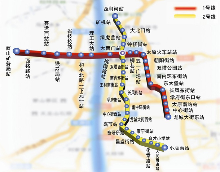2号线一期工程,北起西涧河站,经解放路、长治路、人民路到小店南站,全长25.1公里,共设22站。沿途站点分别有:西涧河站、矿机站、大北门站、缉虎营站、钟楼街站、大南门站、双塔西街站、南内环街站、王村南街站、长风街站、学府街站、南中环街站、中心街西站、龙城大街西站、嘉节站、畜研所站、康宁街站、昌盛街站、育才小学站、化章路站、人民南路站、小店南站。