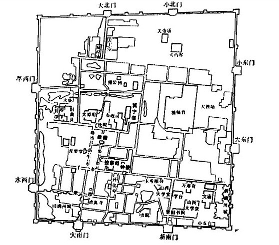 城垣已毁,城门及城楼也不复存在,城内古建,诸如寺宇、殿阁、衙署、豪宅,也七零八落,存之不多。古老的太原城,虽历史悠久,文化淳厚,但承载它的大多集中在属于非物质文化遗产的古老街巷和街巷之名中。形象一些说,似乎可以称作老街古巷名称中的太原。明清以来太原城的街巷可统而称之为“棋盘形”格局,虽有不少丁字街口,但哪个古老的城市中没有丁字街呢?正是“丁”字和“井”字形街巷格局,组成了太原城的脉络;正是这宽宽窄窄、直直曲曲,相互脉通的大街小巷,在揭示着太原的过去和今天,在承载着太原的沧桑和巨变,在传承着太原的历史和文化。太原的传统街巷包括它的名称,有些来自官衙,有些来自寺庙,有些来自商市,有些来自古老的坊厢,当然还有些来自最初的大族、旺户、豪宅和名人府第。