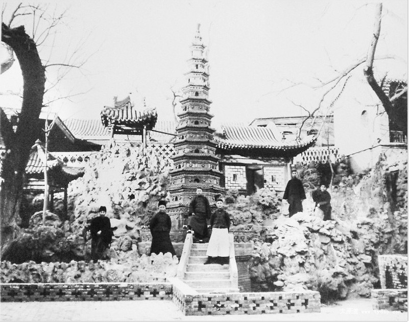 上面这张照片是民国年间的太原四美园。从照片上可以看到,位于假山上的琉璃塔精美别致,和谐稳重。塔的名称为“四美琉璃塔”,游人正驻足于塔前合影留念。上世纪50年代,此塔被移放到文瀛公园的文瀛湖畔,至今保存完整。
