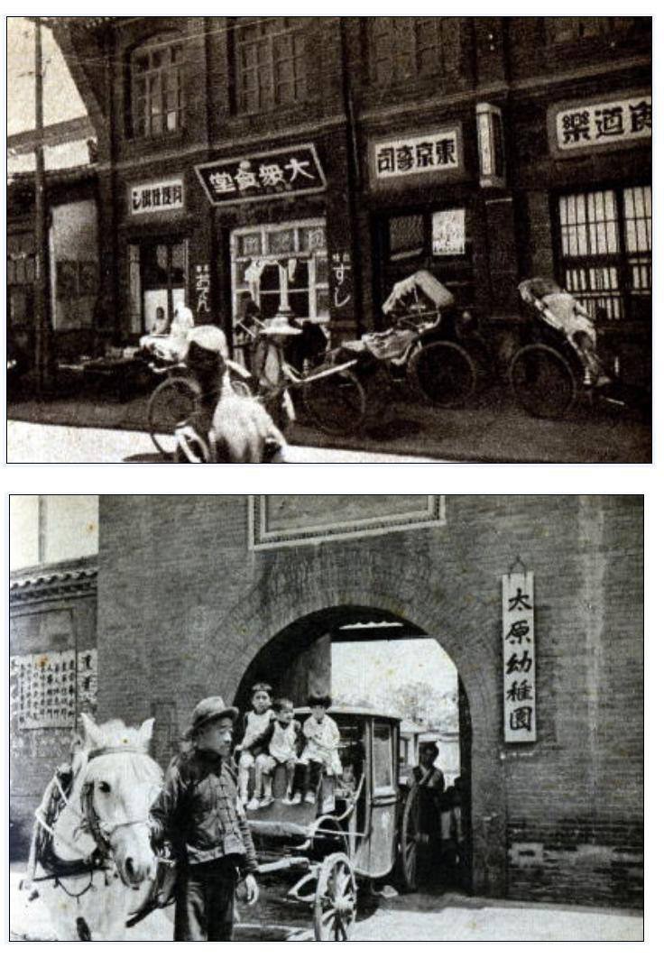 上图为太原街景,照片中有“东京寿司”等日式餐饮 下图为太原幼稚园,应该是日本人子女的幼儿园