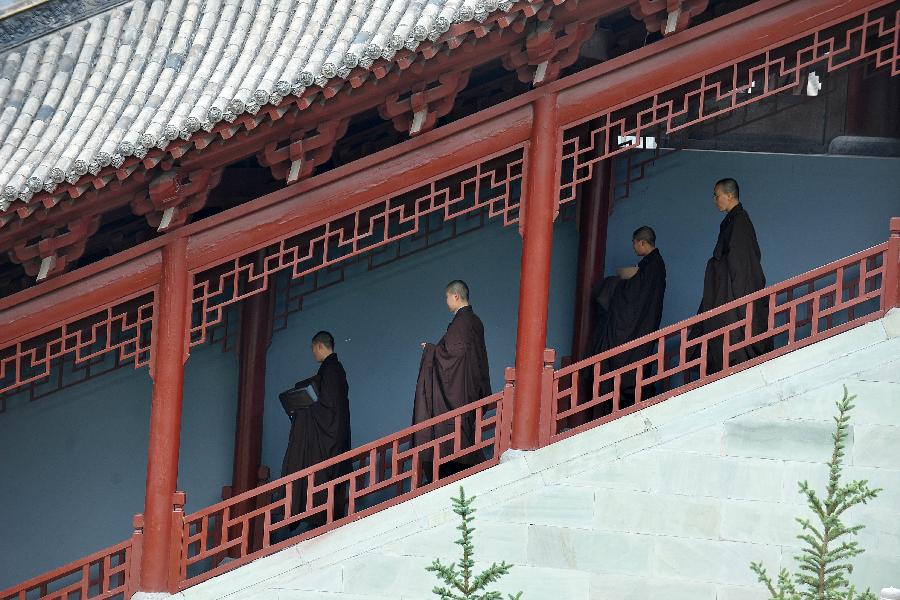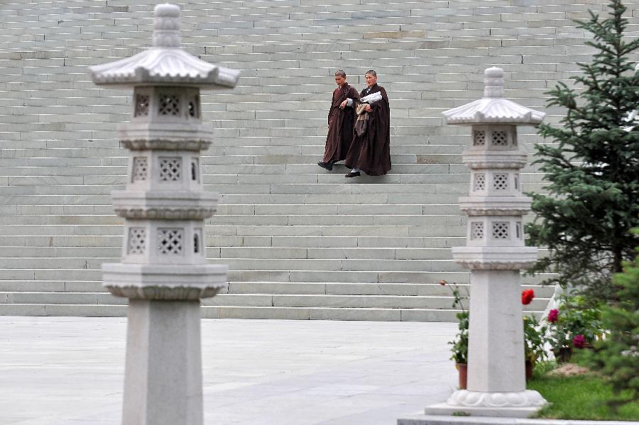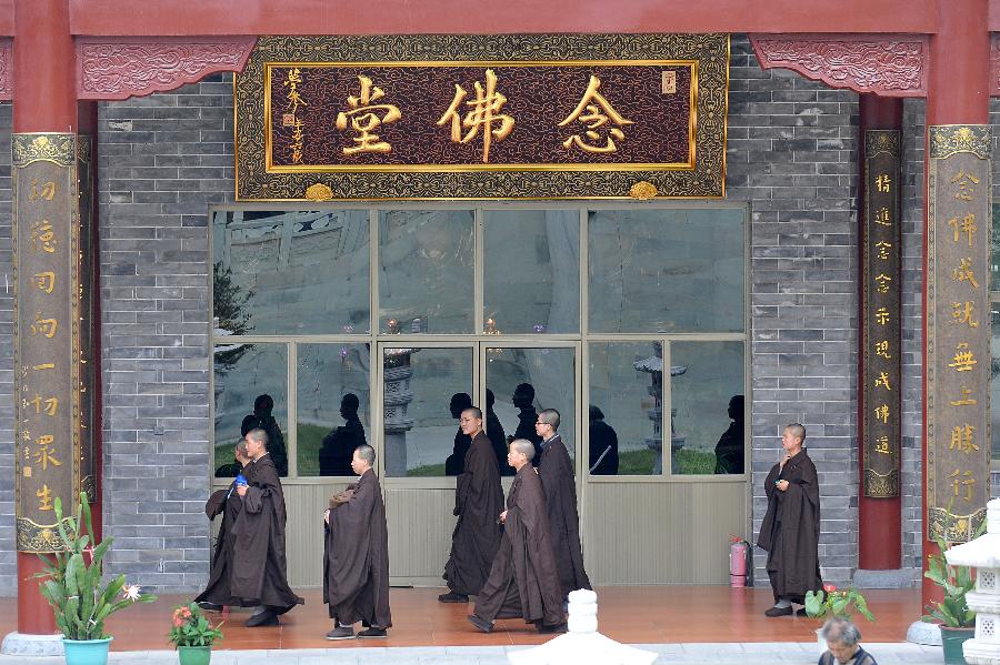 2012年8月25日,五台山普寿寺尼众佛学院的尼众从念佛堂前走过