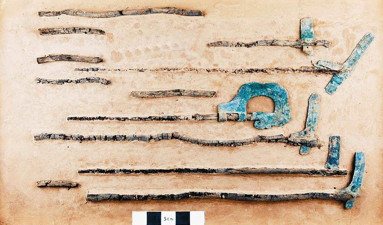 接下来的发掘让考古队员越发兴奋,墓室内棺椁之间及二层台上发现有带木柄铜兵器和漆木盾牌等,在棺椁之间或棺盖上发现了大量的青铜器、原始瓷器、陶器等物。