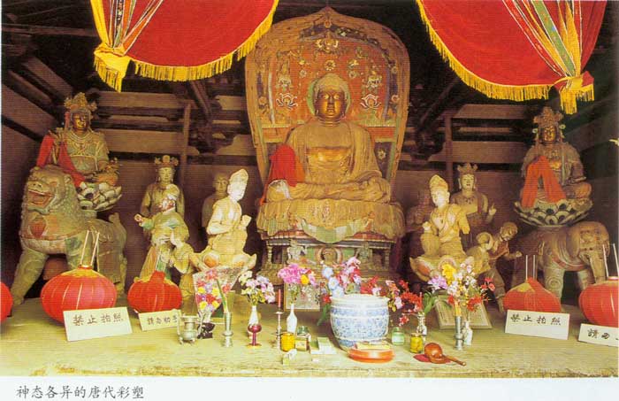大殿内现存17尊唐塑佛像,均为唐代珍品。整个佛像群以释迦牟尼佛为中心,姿态自然若动,表情逼真有神,丰满优美,夸张适度,衣纹简练准确,和谐流畅,同敦煌莫高窟唐代塑像如出一辙,表现出唐代雕塑匠师高超的艺术水准。