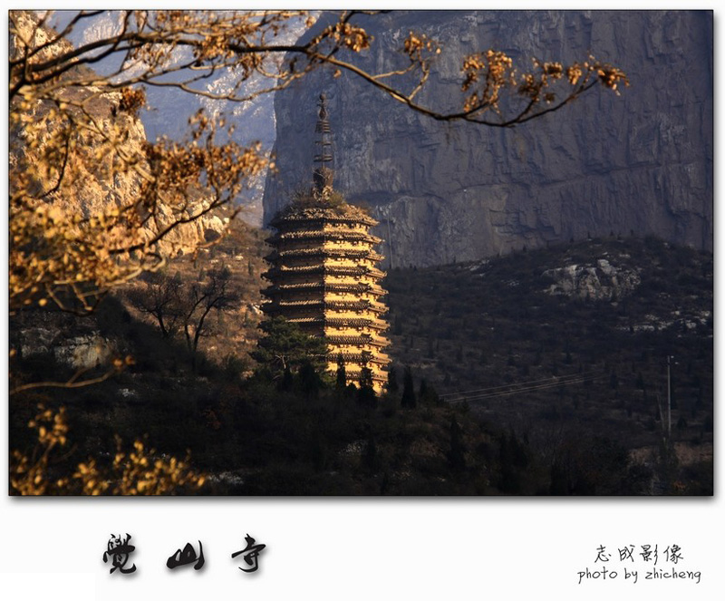 从灵丘县城往南,车行大约20分钟的样子,忽然远处起伏的山峦立起一道墨绿的屏风,这个时候,道路的右侧会出现一条窄窄的小路,沿此而上,一座高高的密檐砖塔眨眼就到了跟前,这就是觉山寺了。