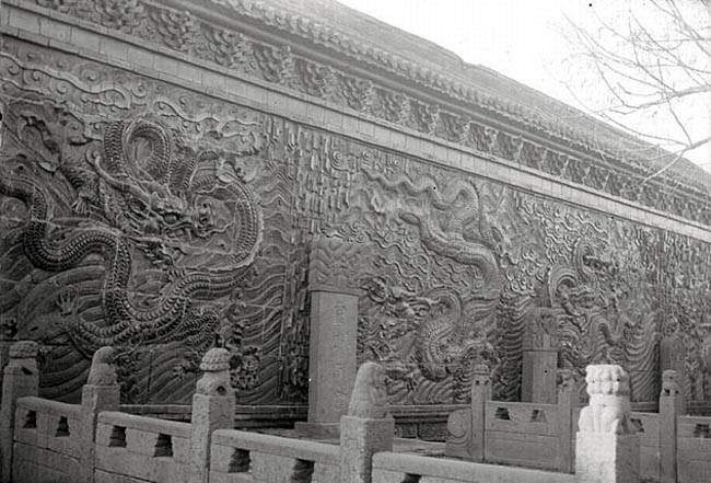 鹿角、蛇身、驼头、兔眼、虎口、鹰爪、马鬃、鱼鳞、鲤须……古人在创造龙的形象时,把世界上能体现动物力量和健美之优点汇集于一身,并赋予神秘色彩,终使其成为皇帝的象征。一路传承发展,龙壁成为古代建筑中一道独特的风景线,一般用作建筑物的照壁,多建于皇宫、王府、庙宇门前,既能作为院落建筑的屏障,又能烘托建筑物,使其展现肃穆、壮丽的风貌。