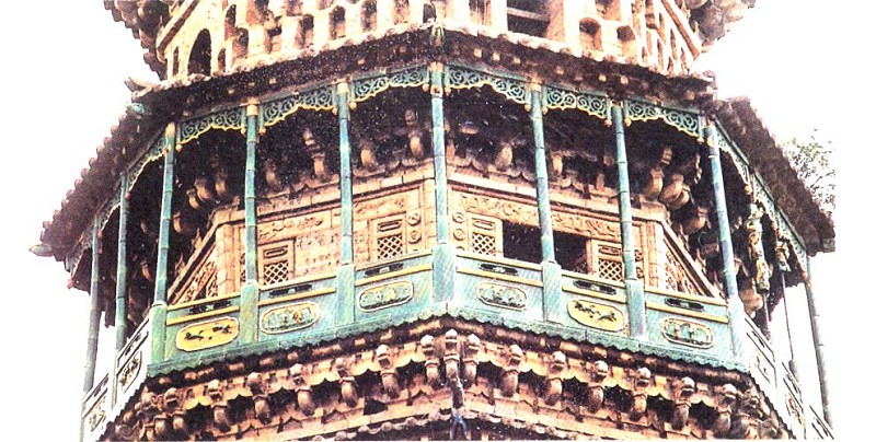 大塔内部可谓独具匠心:塔底南面有塔门,门框、门枕皆用青石雕凿成鱼、狮等吉祥物。塔的每层都建有门窗,便于观赏外部风光。为减弱局促狭小的空间带来的压抑感,内室皆用条砖砌筑成穹隆顶。三层以上,凡所视之处,各层顶部皆做均向外伸延砌出仿木结构塔檐、琉璃牙檐。在塔的六层,东西南北四壁各镶嵌一块琉璃堆塑画。“图案分别是四大佛教名山。”经常陪同游客登塔的张奇升毫不费劲地登上塔的第十层:一圈用琉璃制成的平座,每面分3间,共24间。平座上的檐柱、栏板、雀替、花晕、椽枋等构件,全部采用当地有名的琉璃世家乔家的彩色琉璃制作,整个悬阁式环廊珠光宝气,耀眼生辉。“当初建造者在设计大塔时,特意将第九层檐顶建造成平座,方便游客环视周遭景色;其上八面立24根檐柱,用来支撑上层挑檐之重。”凭栏眺望,好似置身空中楼阁,张奇升颇为自得,“这是咱北方地区绝无仅有的楼阁式琉璃塔,被中国古塔研究专家张驭寰称为‘上党明塔之冠’呢!”