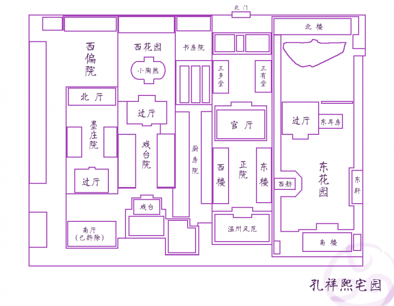 孔家宅园占地6324.5平方米,由六院两园组成,即正院、书房院、厨房院、戏台院、墨庄院、西偏院,另加东、西两处花园。
