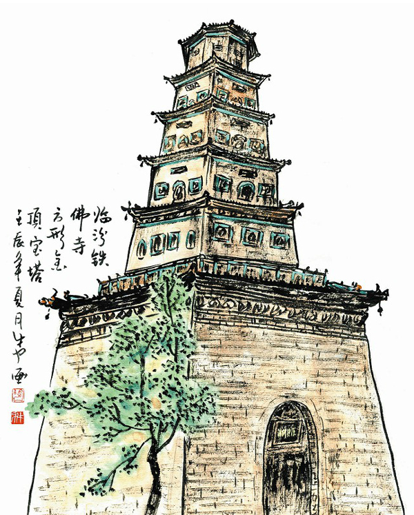 宝塔底层长宽各12米,塔身离地面膝高位置,刻有束腰式肩雕,间柱中雕有突起的龙、虎、兔、麒麟、奔马及花卉瓜果等图案,雕工细致,栩栩如生。底层每面砌依柱4根,分作3间。二层以上无依柱,实为1间,并且四面皆作束腰须弥座,在塔身四壁向内雕砌,构造别具一格。