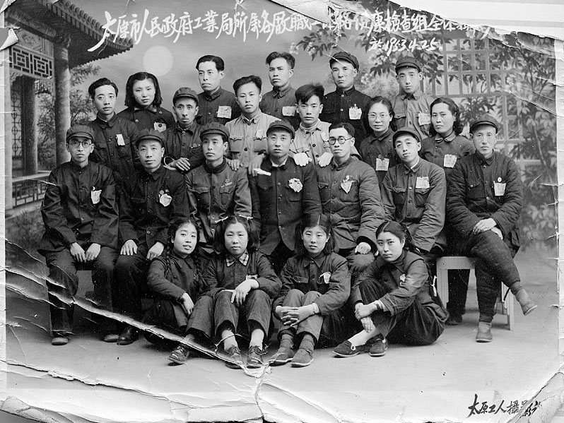 那时,姑父曹培林(后排右一)从部队卫生员的岗位上光荣负伤复员后,被安排在太原市政府工业局卫生科。在这次职工体格大检查中,姑父负责呼吸系统检查及数据统计工作。时值第一个五年计划实施的开端及抗美援朝第三年,工作条件相当艰苦。从照片中可以看出检查组成员衣着简朴,胸章是用白布条印制的,皱巴巴地缝在上衣口袋前。姑父回忆,每次去一个厂矿开展工作,都是步行或骑自行车,检查中所使用的医疗器械不是手提肩扛就是自行车驮带,根本没有公务用车这一概念。如果要去离市区远点的厂矿,那一天来回两趟至少要走四五十里路,还要工作十几个小时。午餐自行安排,若所在的工作单位有职工食堂,则检查组人员到食堂排队打饭,餐费自付;若没有食堂,姑父则早晨出门自带干粮,中午用开水泡着吃就可以了,而可口的菜肴就是大葱大蒜。尽管工作条件艰苦,但没有一个人叫苦叫累。姑父说,这比起战争年代来说幸福极了,没有炮火,没有枪声,可以专心致志地工作、学习和生活。