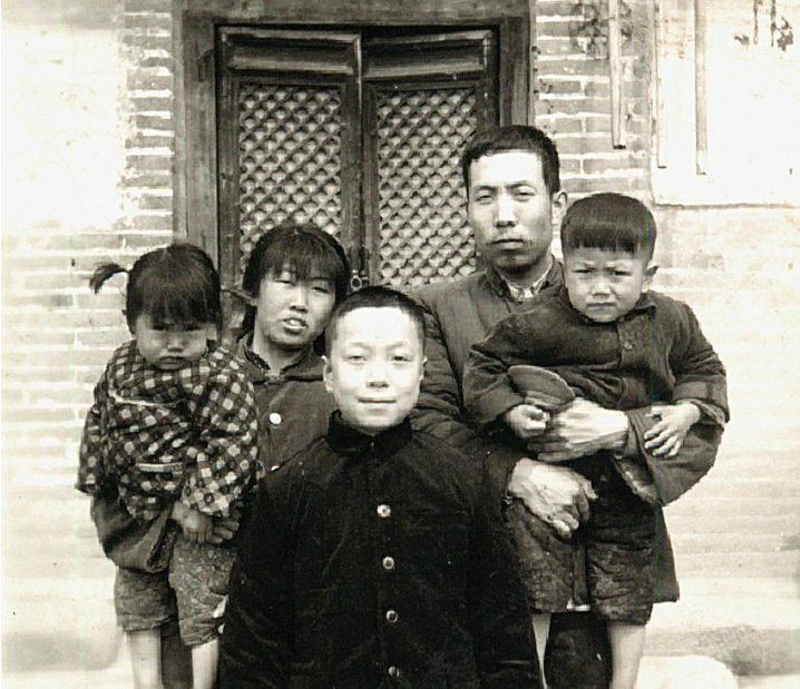 这是我家第一张合影,拍摄时间可能是1978年冬天,是在我家老屋门前拍的。站在右首的是20多岁的父亲,当时他担任大队会计,手里握着一顶帽子。他穿着那个时代普通的干部服,怀里抱的是我。我那年5岁,穿着肥厚的棉衣,梳着母亲给理的萝卜头,眉宇间有一种不易察觉的欣喜。左首是梳着长辫的母亲,她抱着小我一岁的妹妹,她的嘴撅得老高。叔父正值少年,穿着肥大的学生装,满脸阳光。