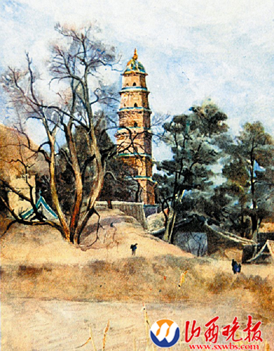 1893年11月,33岁的英国女画家艾米丽·乔治亚娜·坎普来到太原。她的父亲是一位传教士,数年前来山西传教,他的姐姐、姐夫也跟随父亲而来。在太原居留期间,艾米丽游遍远近名胜,创作了一系列画作,其中水彩画《古塔》,为人们呈现了晋祠舍利生生塔的状貌。 艾米丽到太原没多久,就到城西南悬瓮山麓的晋祠游览采风。艾米丽在她的游记《中国的面容》中写道,“山腰间,一座富丽堂皇的古庙被年代久远的树遮蔽着,正面的柱子上盘绕着引人注目的金龙。” 艾米丽所说的古庙,就是著名的晋祠。晋祠外有一温泉,泉水汇成溪流,溪流穿过小桥。艾米丽立于石桥之上,抬眼望去,一座古塔通体金黄,塔檐镶嵌的琉璃瓦发出耀眼的蓝色。此时已经进入冬季,尽管除却坚韧的松柏外,树已落叶,草已枯黄,但在阳光照耀之下,远山近景呈现一片辉煌。“简直太迷人了!”艾米丽被眼前的景色惊呆了。她立刻打开画夹,在溪畔绘下了这幅《古塔》。艾米丽回忆,要不是有温泉,写生根本没有可能,因为水融的颜料会结冰。过不了几分钟,她就要把颜料盒放进小溪,融化颜料表面的冰碴。 艾米丽描绘的古塔,正是位于晋祠浮屠院中的舍利生生塔。该塔创建于隋开皇年间,宋代和清代两次重修,塔高三十八米,八角七层,琉璃剪边,秀美挺拔。至夕阳西下时,一天云锦,满塔生辉,极为壮丽,被誉为“宝塔披霞”。 晋祠离太原城50多里,因为要赶在天黑之前返回城内,艾米丽没能够欣赏到宝塔披霞的壮丽景色,但阳光映照下的古塔之状貌已经让她陶醉了。 艾米丽在太原住了将近一年,1894年10月回国。1907年秋,47岁的艾米丽再次来到中国,在太原短暂驻留。在中国的半年时间里,她游览了山东、河北、湖北、四川、云南以及东北三省。艾米丽曾因其探险经历被法国地理学会授予勋章,除了创作绘画作品外,还陆续出版了《中国的面容》《满洲、朝鲜、俄属土耳其斯坦的面容》《漫游中属土耳其斯坦》等书。《晋祠古塔》创作时间大约是1893年12月,至今已经整整119年。 编者注:目前,舍利生生塔依然矗立于晋祠景区,有关部门正欲对其进行修缮。 ■ |