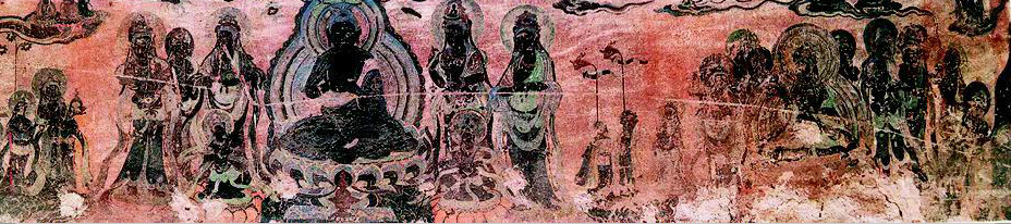 弥陀说法图,山西省五台县佛光寺唐代壁画。 位于东大殿前槽北次间栱眼壁上,分三幅布列,中幅弥陀佛结跏趺坐于莲台上作演讲状,胁侍菩萨左右侍立,供养菩萨蹲于坛前两隅。图幅虽然不大,人物、流云、飞天各尽其妙,极其珍贵。惜年已久,铅粉皆变铁青色。 |