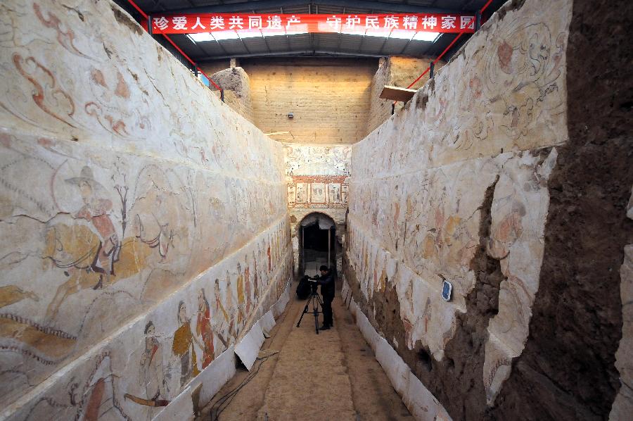 开掘后的忻州北朝墓葬2013年尾设公众开放日,记者得一睹幽深墓道之壁画,其奢华煊赫炫目摄心—— 经过5个月的发掘,忻州九原岗北朝晚期壁画墓揭开神秘面纱。2013年12月25日,省考古研究所组织省内外数十家媒体,进行了墓葬考古发掘现场公众开放日活动。记者随行到现场采访,1500多年前北朝贵族的狩猎场景在幽深的墓道两壁上呈现,其奢华煊赫的生活于历史深处探出一角。特别是墓道北壁上的一座木结构门楼,是第一次用绘画形式展现了古晋阳时期北朝建筑的风采。 A 墓葬主人无从确定墓葬年代初步推断 九原岗北朝壁画墓位于忻州市忻府区兰村乡下社村东北,是忻州市市级文物保护单位九原岗墓群中被盗较为严重的一座。山西大学考古学硕士研究生景耀忠在野外调查时发现了这座被盗墓葬,因墓内有壁画,价值重大,随即报告给本校考古系教授郎保利,并与省考古研究所取得联系。2013年3月,省考古研究所组织专家组赴现场勘查。6月下旬,经国家文物局批准,由省考古研究所与忻州市文物管理处联合组成考古队对其进行抢救性发掘。经过5个月的考古发掘工作,共清理壁画约200余平方米,出土大量陶俑残片及少量的陶器、瓷器残片、数十件铁质棺钉。最重要的是在墓葬清理过程中,对壁画进行了初步的加固与现场保护。 省博物院学术委员会主任、研究员渠传福是这次考古发掘的执行领队。他指着满目凄凉的古墓说,墓葬因多次被盗,记载墓主生平事迹的墓志也已被盗,而出土的人体骨骼数量也较少,且保存状况较差,暂时还不能判断墓主的性别和年龄。据当地村民介绍,墓志在十几年前被盗卖,志文中有“秀荣大将军”几个字,结合墓葬规模推测,墓主应该位高权重,是北朝时期高氏集团的核心人物。从壁画中人物形象和表现手法来看,该墓与太原北齐徐显秀墓、娄睿墓有许多相似之处,初步推断其年代为北朝晚期。 2013年12月24日,国内12位著名的考古学者来晋对忻州九原岗墓葬进行现场考察后,对壁画墓的学术价值给予高度评价。留在现场为媒体做讲解的国家博物馆原田野考古部主任、研究员信立祥说,该墓葬是北朝晚期某个高官权贵的墓,从规模和形制判断,等级和河北磁县湾漳大墓相当,而那座墓的主人,据推测是北齐文宣帝高洋。所以该墓葬的主人无疑也是北朝很高等级的权贵,是北朝高氏集团的核心人物。该墓葬的发掘对研究北朝晚期社会生活、绘画艺术以及我国古代建筑史具有非常重要的意义。同时说明,至少在北朝晚期忻州就是一个胡汉相融、文化多样、各民族和谐共处的重要地区,凸显了历史进程中的重要位置。 B 《狩猎图》为研究北朝社会生活提供佐证 记者在现场看到,九原岗北朝墓位置在下社村的一片玉米地中,这也是墓葬屡次被盗的原因之一。墓为长方形斜坡墓道砖砌单室墓,由墓道、甬道、墓室三部分组成,南北总长约40米,墓室上方有封土堆。墓道长30.5米,底部最深处6.55米。墓道两壁呈阶梯状,由上至下分为四层,每层均绘有壁画。墓道东壁中部有一竖直的长方形盗洞,盗洞挖至墓道底部,东壁第四层壁画几乎全部被毁。甬道位于墓道与墓室之间,平面呈长方形。甬道南端原砌有石门,现仅残存石质门楣,据当地村民介绍,石门及墓志于10年前被盗走。甬道两壁及顶部均绘有壁画,可惜破坏严重,现仅残存顶部小面积壁画。墓室边长5.4米、高约8米,穹窿顶。四壁墙体原均有壁画,现已被大面积盗揭,仅顶部保留有星象图。墓室西北角有一盗洞,墓室内部被盗扰非常严重,地面零乱堆积有残砖、棺木以及盗墓者遗留的毛毯、矿泉水瓶等日常用品。 历代都有《狩猎图》,但九原岗北朝墓中的《狩猎图》则是我国现存墓葬壁画中最长的一幅。游走在墓道中间,仔细观望,在30.5米的墓道东、西两壁上绘制的壁画自上而下各分为四层。第一层高1.5米,主要绘有畏兽、仙人、飞鸟、神兽等形象,四周以流云、忍冬补白,其中有两个神兽分别是《山海经》中记载的“駁”,一种食虎豹的马和“疆良”,一种食蛇的怪兽。东、西两壁第二层壁画内容均为狩猎图,所绘人物、动物形象生动,山水、树木造型粗犷,狩猎内容非常丰富。在西壁第二层壁画南部还出现有两个中亚人的形象。第三层为出行仪仗,所绘的19位武士均为站立形象,身上佩戴弓箭和大刀。西壁南端绘有一骑马的少年,其前方为一只猎狗和一只雄鹰正在捕杀兔子,少年右臂前伸似在指挥捕杀活动。东壁第四层因开挖盗洞已全部被毁,西壁第四层亦为站立的武士形象。在墓道北壁,绘有一座规模宏大的木结构建筑,庑殿顶,建筑中的一砖一瓦以及建筑门楼内的6位人物,其形象都描绘得非常生动逼真,特别是双柱式的斗拱在以往的资料中未曾见过。屋顶正上方绘一火盆,左右两侧各绘一兽首鸟身的怪兽形象。 面对这组壁画,中国社会科学院研究生院考古系教授杨泓说,九原岗墓道壁画对魏晋南北朝这一阶段考古学来讲,是非常重要的考古发现。从狩猎壁画内容及规模来看,该墓无论是对地下世界的想象还是对现实生活的描绘都比同时期其他墓的壁画内容更加丰富,手法更加逼真精细,这些壁画的发现,为研究北朝社会生活提供了佐证,对兵器马具、绘画艺术的研究都具有重要意义。特别是墓道北壁壁画中的木结构建筑在同时期墓葬中是首次发现,是第一次用绘画的形式展现了古晋阳时期北朝建筑的风采。总