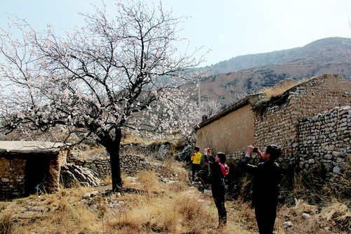 4月的大莲花村,杏花飘香。家家户户院子里都有几株杏树,盛开着淡粉色或白色的花朵。村内的房子略显陈旧,偶尔几缕炊烟袅袅升起,萦绕在这古屋、杏丛之间,倒是一番世外杏园的美景。