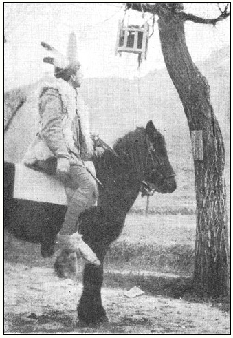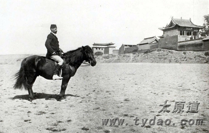 《穿越陕甘》一书中第一张出现的照片是克拉克考察队队员阿里的骑马照,以此来缅怀和纪念这位不幸遇害的测绘员 这张照片拍摄于太原,经老照片专家水锅锅确认,背景为小五台寺庙和太原府城东南角楼