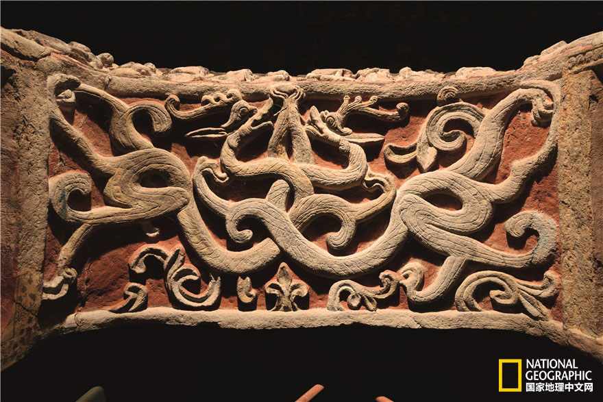 交缠的双龙相向而视,造型质朴,富有张力,雕刻手法纯然汉风。 交缠的双龙本是西亚安息王朝的装饰母题,出现在中国的石窟寺,反映了佛教艺术在东渐过程中的兼容并蓄。