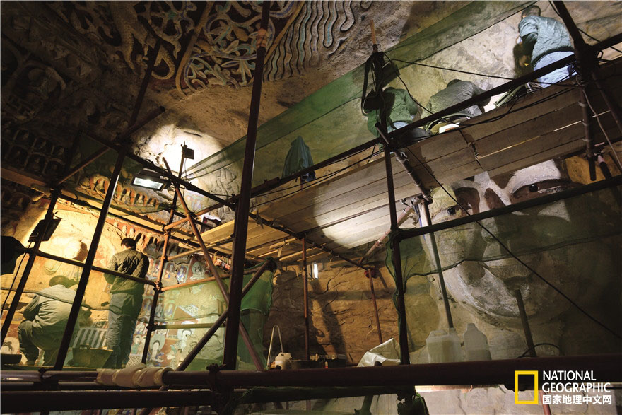 巨大的佛像在搭起的脚手架间时隐时现,技术人员小心翼翼地清理着塑像、彩画上的灰尘,为进一步修缮做好准备。 云冈石窟年代久远,石质疏松,维护工作任重而道远。