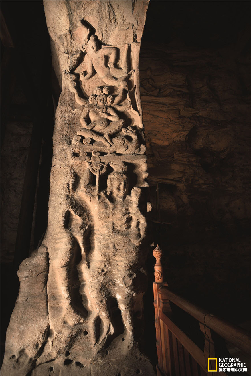因为室内雕刻有大量的乐伎及乐器形象,12窟俗称“音乐窟”。 透过上层的明窗望向前室,顶部的翩翩飞天与前室柱头上方正在表演的伎乐天营造出佛国净土热烈而祥和的气氛。