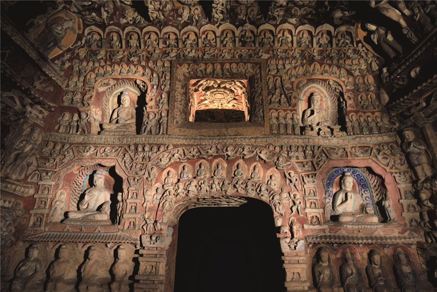 五华洞之一第9窟前室雕刻华丽,六角形石柱高大雄伟,北壁上辟明窗,下设拱门,是进入后室的通道。 雕刻中表现了大量的建筑元素,既有欧洲艾奥尼柱头,也有中式的人字拱,反映了东西方结合的云冈艺术特点。