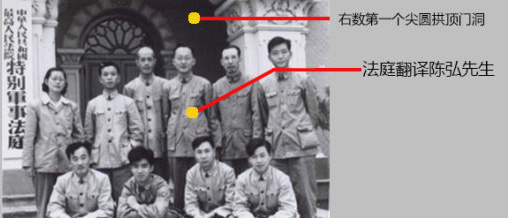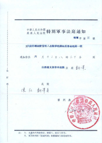 图2.(太原)特别军事法庭为陈弘寄送的出庭通知及陈弘在太原法庭现场进行翻译的工作照(右一) |