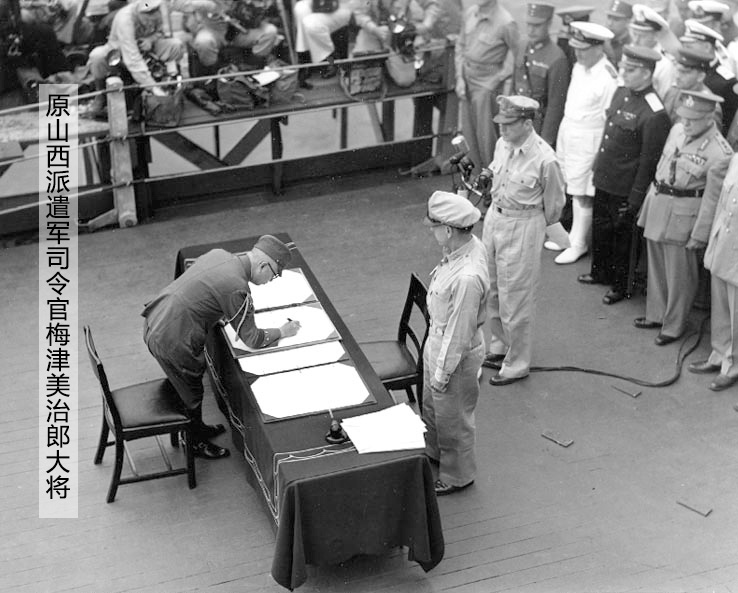 而历史有时候就是这样巧合,曾任第一军司令官的梅津梅治郎及其后任曾长期不遗余力的推行瓦解阎锡山的“对伯工作”计划,而最终梅津代表日本政府在美军密苏里战舰上签署了货真价实的降书,而代表中国参加受降仪式的代表恰是曾出任山西省政府主席的山西崞县人徐永昌将军。正如王炳文在1946年《中国抗战损失说帖》中所言:“各省遇战县数多少不一,山西省特多计六十一县......概括言之,山西境内不独争斗频繁,规模亦特巨大。”所以我们或许可以认为密苏里战舰上的受降式也是另一种意义上的“山西受降式”吧(图5)。当徐永昌代表中国在受降书上签字时,也包含了对八年中为山西民族独立献出鲜血与生命的人们的纪念、缅怀与旌表,或许也是对山西第二战区所谓秘密受降的反讽吧。 |