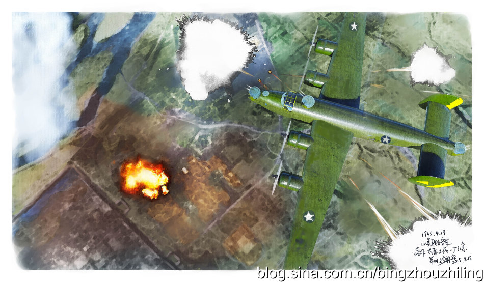 综合各方面线索我们初步可以判断,太原火药一厂确实被美军成功轰炸,但4月19日作为”夏“季确属勉强。假设《日军侵晋纪实》中关于”1945年夏“记载确凿的话,那么我们可以得出美国陆军航空兵对太原火药一厂实施了至少两次轰炸;假设《纪实》中的时间记载略有偏差,则4月19日很有可能就是成功轰炸太原火药厂的准确时间了。 值此抗战胜利70周年,日本裕仁天皇宣布“终战”投降70周年之际,特绘制美国陆军航空兵第14联队轰炸机编队轰炸太原火药第一厂想象图以为纪(图1)。 |