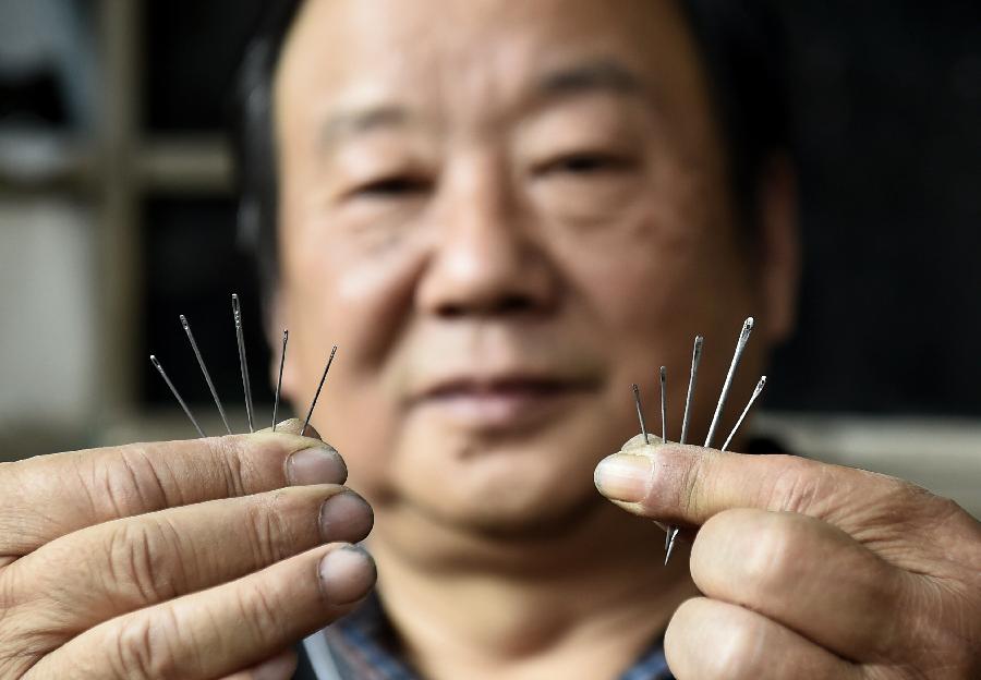 2015年9月25日 最后的手工制针人 裴向南展示手工制针(右)与机械制针的区别(9月24日摄)