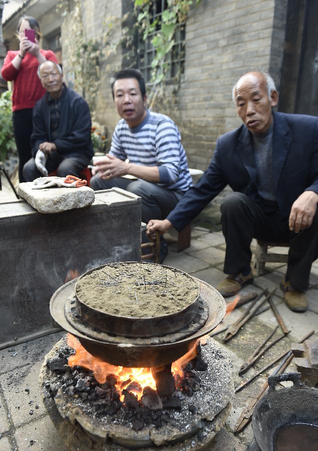 大阳镇的老匠人李双炉(右)在蒸制针坯