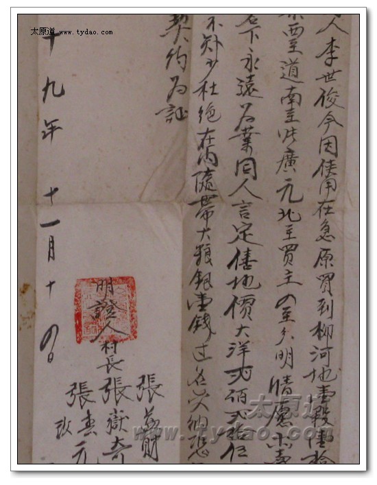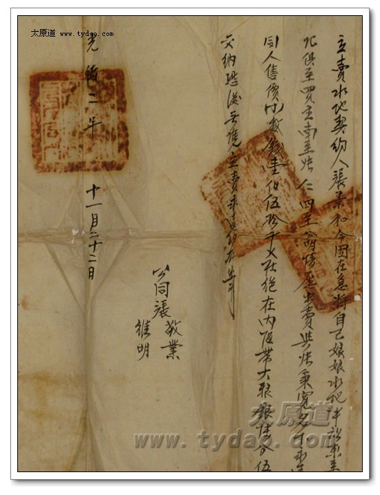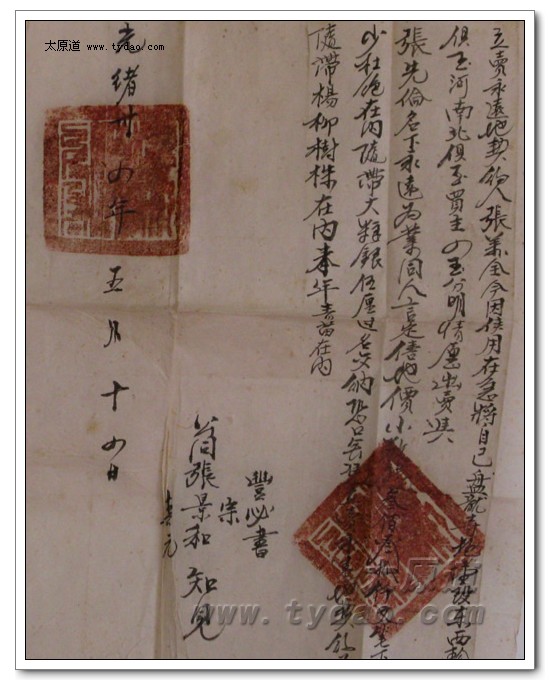 这些契约中,年代最早的两张分别订立于光绪元年和光绪二年,历史可以追溯到我爷爷的爷爷,也就是我的高祖。光绪二年(公元1876年)十一月二十日订立的这张地契,购买的是水浇地半亩,价格为一百五十千文,大致相当于现在的三万元。在这张地契上,日期、价格等三处分别盖有县府的官印,此外,地契左侧还可以看到半个官印,那是加盖的骑缝章。 |