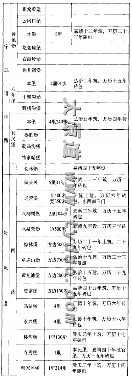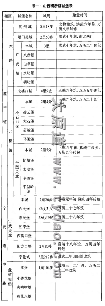 山西镇辖冀宁、冀南、雁平、宁武、岢岚五道,冀宁、冀南两道,“不近虏巢,未分边隘,惟设火路墩”。根据时人杨时宁《宣大山西三镇图说》和《太原府志》等史志的记载,雁平、宁武、岢岚三道的城堡共有64(见表1)。