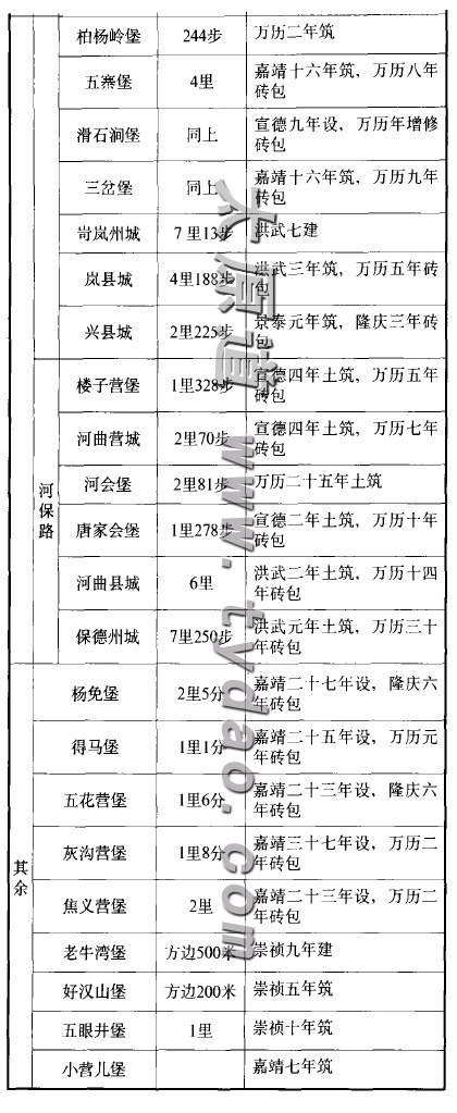 从位置上看,山西镇边在大同镇边之后,起着支撑加固大同镇边,阻敌深入的作用。明际顾祖禹在《读史方舆纪要》中对三关的重要军事地位有精辟的论述,宁武关,“居两关之间”,为“东西要害”;偏关“西接黄河,与套虏仅隔一水”,“三关险要虽同,偏关尤急”;雁门关,是西部“大州之冲”,南部“郡县之路”,“皆为虏冲”。这一镇边“山势连亘,实天造之险固”。为了更有效地抵御蒙古人的侵袭,明朝于此设卫所,开军屯,修边墙,立烽燧,营筑堡寨。有明一代,山西边地究竟修筑了多少堡寨呢?