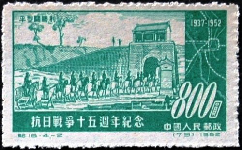 平型关曾经两次出现在中国邮票上,一次是1952年,编号纪16中面值800圆的一枚;