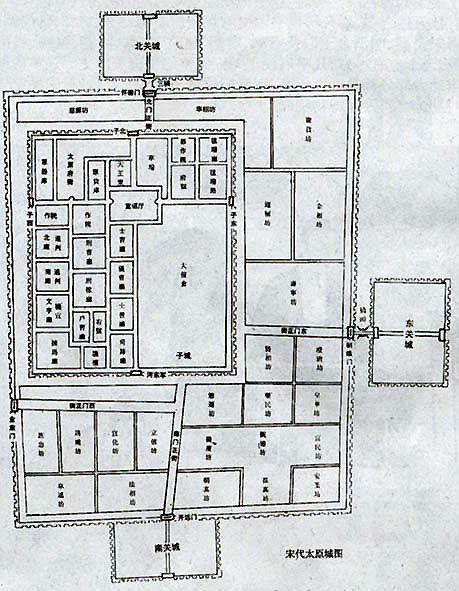“周一十里二百七十步,宋太平兴国七年建。四门,东曰‘朝曦’,南曰‘开远’,西曰‘金肃’,北曰‘怀德’”。与唐“太原三城”,“周四十二里,东西十二里,南北八里三十二步”相比,真可谓小巫见大巫。宋太原城自创建后,因其为并州冶所,更因其地处宋与辽两国相接的边陲之地,为加强其军事防卫能力,在淳化三年(公元992年)后,又陆续增建了南关城、东关城和北关城。史载,所以增建这三座关城,就是为了“以处屯兵”。此外,宋太原城还包括一座城中之城,它的名字叫做“子城”。对于子城,《永乐大典·太原府》载:“周五里一百五十七步,宋太平兴国七年筑。四门,南门有‘河东军’额,因唐旧也,鼓角漏刻在焉(民间谓鼓角楼)。余三门相承以子东、子西、子北目之。”