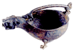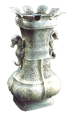 两件相同的高柄小方壶,则展现了精湛熟练的装饰工艺。壶形体修长,线条极为流畅。通体剔底,形成壶身的几何网格凸纹和壶柄凤鸟凸纹,再镶嵌以绿松石,经打磨光滑,至今仍浑然一体,华美无比。 |