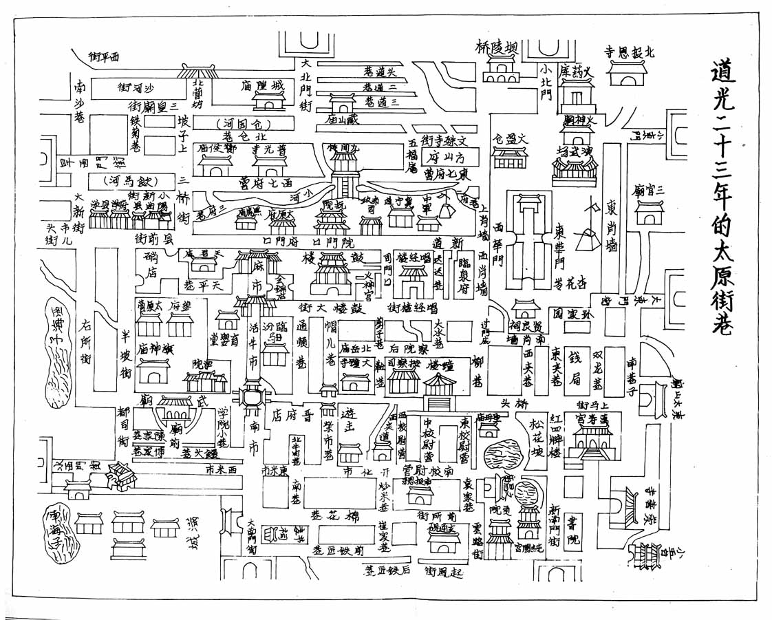 元好问“官街十字改丁字”,描绘出宋建太原城街巷呈“丁字”状的情形。纵观太原街道名称,多因其社会功能的不同,与过去手工作坊、集市贸易有关,如西米市、帽儿巷、柴市巷、棉花巷、剪子巷等;或以古建筑称谓,如钟楼街、纯阳宫街、东华门、南肖墙等;也有以古代兵营而得名,如校尉营、精营街;还有以地形特征命名,如海子边、水西门街、旱西门街等;太原唯一以人名命名的街是位于文庙西侧的狄梁公街。