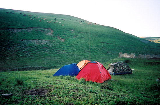 夜幕很快降临,凉风习习,吃过晚餐之后,大家披着衣服围坐在篝火边聊天,两位牧场的职工好奇过来与我们攀谈起来,尤其对我们的装备非常感兴趣,临走时,他们告诫我们晚上不要离开营地,否则很容易被牧羊犬攻击。牧场职工走后,天地间变得异常寂静,不远处的山坡上,莹莹闪亮着几点绿光,阴森而恐怖,那是两只牧羊犬的眼睛,它们长时间蹲守在不远处的山坡上仿佛是要监视我们的行动。我们钻进帐篷不久,就听见帐篷外发出沙沙的声音,仿佛在耳边,好象是牧羊犬在我们的帐篷外嗅着什么,直到沙沙的声音渐渐远去我才安然入睡。