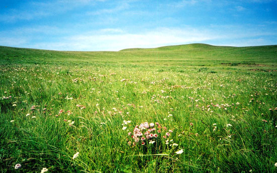 花坡的名字是如此的形象,一面面舒缓起伏的山坡上,绿草如茵,繁花似锦,红色的、粉色的、黄色的,五颜六色的各种不知名的烂漫山花在这里汇聚成一个花的海洋,我已经不知道在这里究竟绿草是鲜花的陪衬,还是鲜花成了绿草的陪衬。山风徐来,花枝招展,随风摇曳,完全是一幅绚丽而富有动感的美丽画卷。河北涞源的一个高山草甸在旅游开发时被称为“空中草原”,花坡,无疑是一座名副其实的“空中花园”。 |