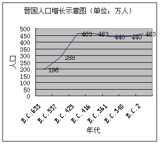 关于晋国历史的研究成果表明,在晋献公开疆拓土、晋文公开创霸业之后,晋国社会持续发展,保持了长期的繁荣景象,维持了百余年的霸业。在这样的条件下,晋国人口持续快速增长(这从上图公元前633年到公元前425年之间的两段增长线可以看出,它在本质上体现为一段平滑的增长曲线,其函数表达式是:y=(1+0.0041)x+196.8,x∈(0,208],208=633-425),年平均增长率接近千分之四(0.41%,依前文研究所得之近似数据计算),略高于全国人口年平均增长率(0.34%)。到晋国后期,人口总量仍有继续增长的势头,但因受到自然地理条件的限制,增长的人口开始外流,所以(原)晋国中心地区的人口总量在以后的一个历史时期里,在四百万左右上下波动。