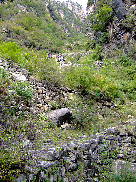 从山神庙往下,山路缘崖边向前,虽然很险,但已颇平缓。沿路石屋处处,大部屋顶坍塌,而墙、券犹存。老张介绍,三四十年前这些地方都有人居住,他们向过往客商出售“黄疙瘩”(一种用玉米面蒸成的干粮,耐饥且不易变干),相当于现在的路边店。此外,路上还有遗存的石槽、石碾盘等物。而在大的平滑的石板上,人们还凿有齿纹,用于防滑。