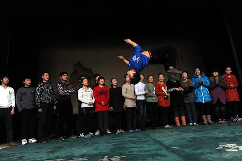 1月28日,在运城市永济县下乡演出前,景雪变(前)为小演员传授水袖功