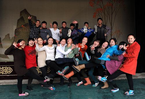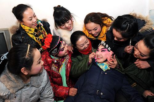 1月27日,在临猗县庙上乡北贯村,剧团里的小梅花奖获得者们在演出结束后合影